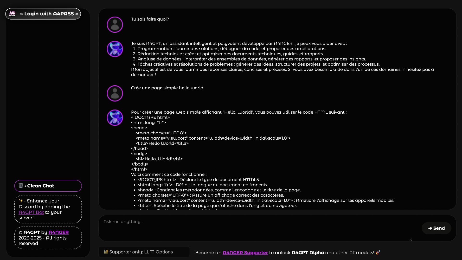 A4GPT est bien plus qu’un chatbot. Il agit comme un partenaire numérique capable de répondre à vos questions, générer du contenu, formuler des idées ou structurer vos projets. Que vous soyez entrepreneur, étudiant, créatif, membre d’une communauté ou simplement curieux, vous pouvez l’utiliser pour vous faire assister dans des tâches concrètes: rédiger un message clair, résumer un document, comprendre un concept, ou encore imaginer un plan d’action.