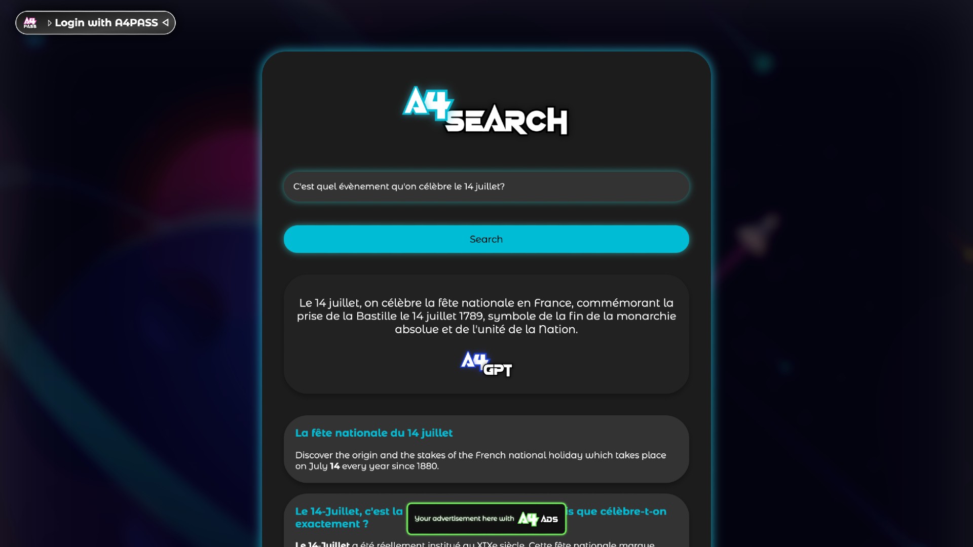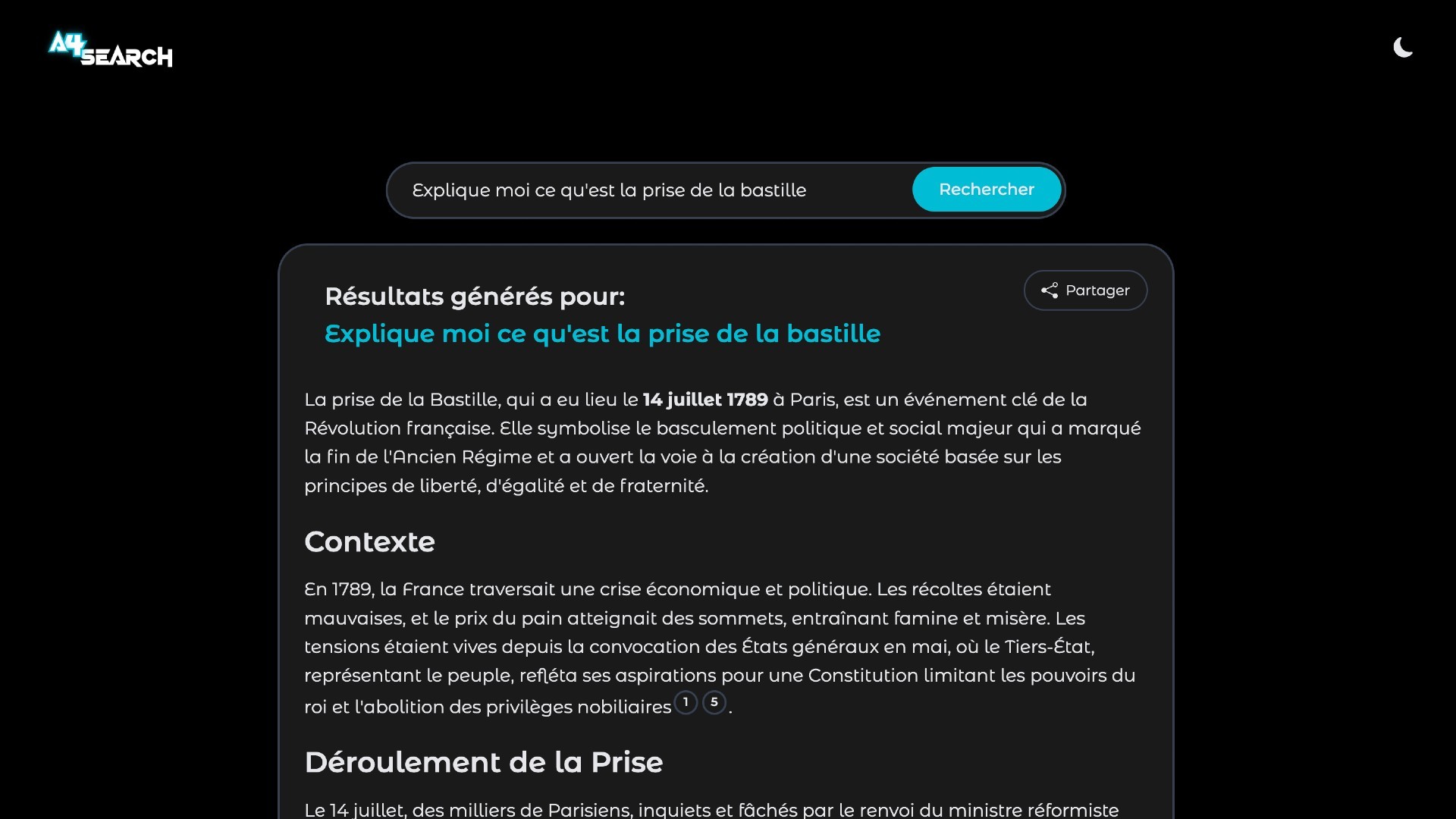 Que ce soit pour comprendre un sujet rapidement, croiser des points de vue ou se faire une idée globale sans avoir à ouvrir dix onglets, A4SEARCH est pensé pour vous faire gagner du temps tout en renforçant votre capacité de discernement. Ce n’est pas seulement un outil de réponse, c’est aussi un levier d’apprentissage.